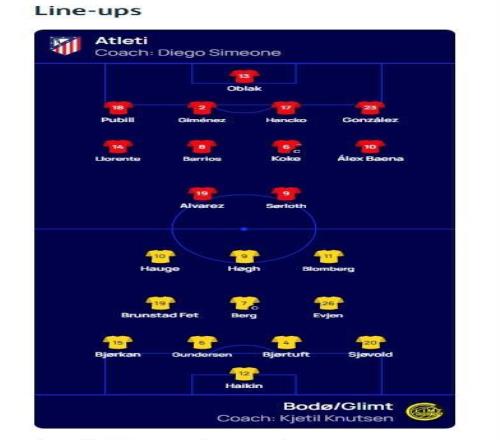 北京时间1月29日04:00,欧冠 联赛阶段第8轮,马德里竞技主场迎战博德闪耀,赛前双方球队首发名单公布如下: