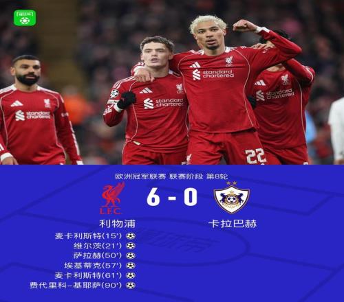 北京时间1月29日欧洲冠军联赛 联赛阶段 第8轮,利物浦对阵卡拉巴赫。利物浦麦卡利斯特梅开二度,维尔茨破门,萨拉赫破门,埃基蒂克破门,费代里科-基耶萨破门。最终比分利物浦 6-0 卡拉巴赫。