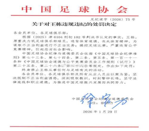 周四,中国足协正式公布受处罚俱乐部名单。天津津门虎被罚10分,王栋、邓小飞则遭到终身禁足。