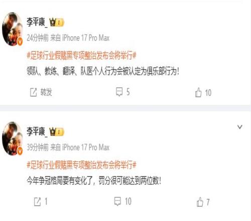 随后,李平康又透露,“今年争冠格局要有变化了,罚分很可能达到两位数!”“领队、教练、翻译、队医个人行为会被认定为俱乐部行为!”记者李璇则表示,“谁也别觉得冤枉,命运的齿轮早在几年前做下事情时就转动了。”